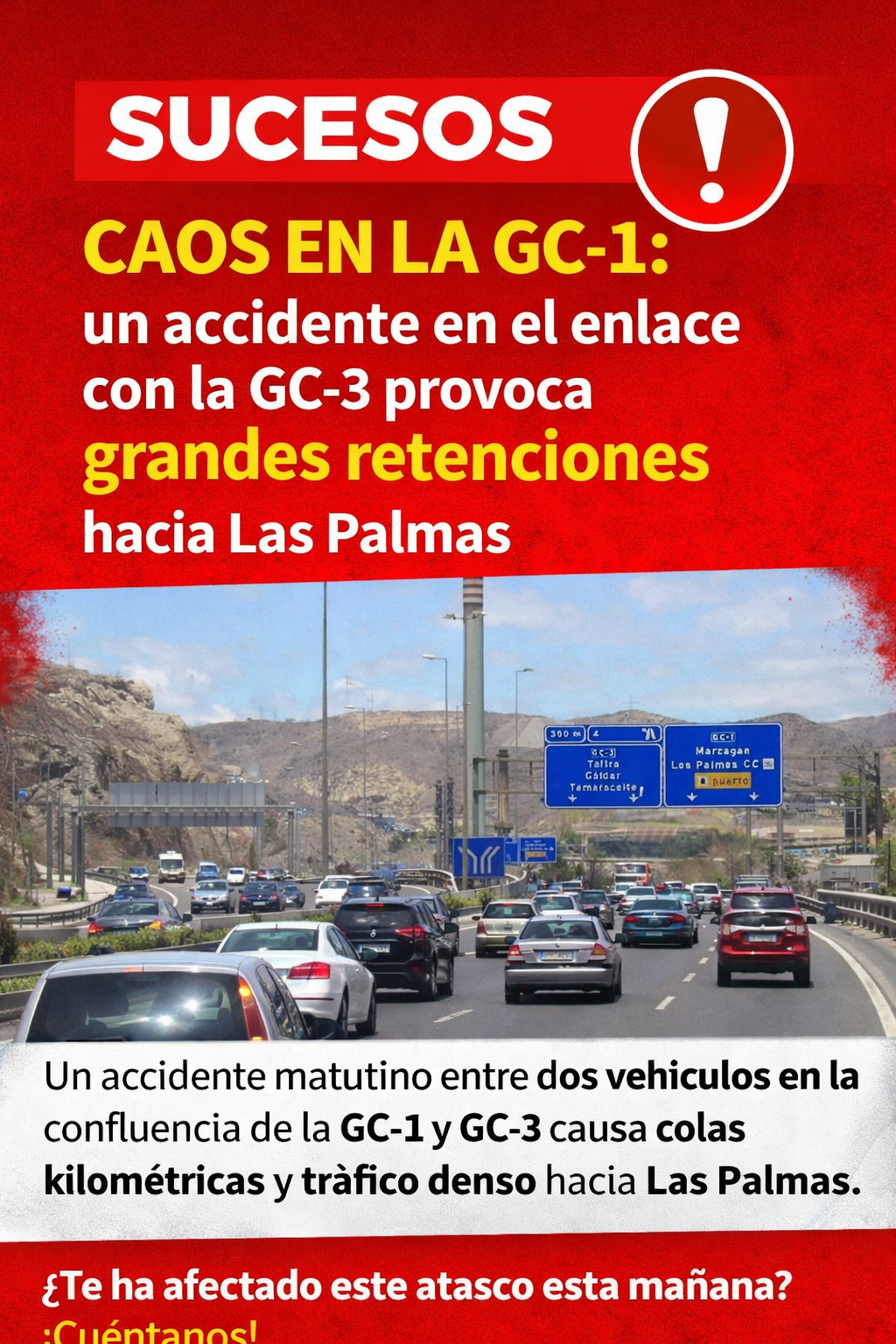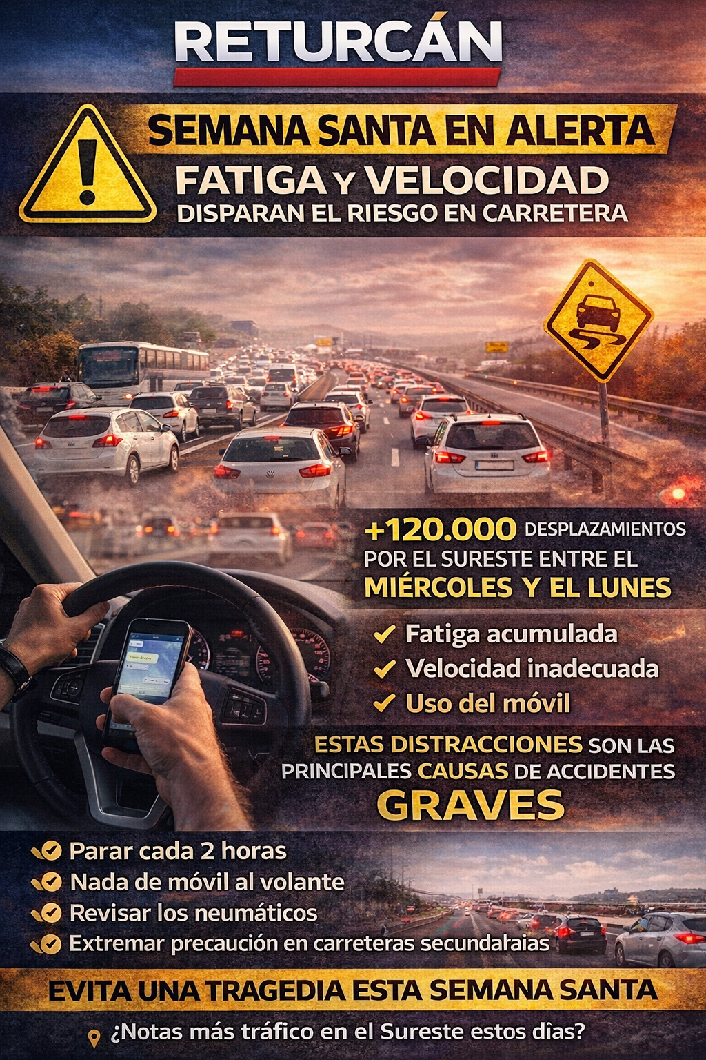 El Sureste de Gran Canaria encara los próximos días festivos con un aumento significativo de desplazamientos, en un contexto donde la fatiga y el exceso de velocidad vuelven a situarse como las principales causas de accidentes mortales. Según un reciente informe de seguridad vial, la concentración de viajes en apenas cuatro días —especialmente entre el miércoles y el domingo— genera un escenario de alto riesgo en carretera. Un cóctel peligroso: prisas, cansancio y distracciones Durante este periodo, miles de conductores se desplazan de forma simultánea, lo que reduce los tiempos de reacción y aumenta la presión al volante. El perfil más habitual del accidente: • Salidas de vía • Colisiones frontales • En carreteras convencionales Todo ello vinculado a tres factores clave: ✔ Uso del móvil ✔ Velocidad inadecuada ✔ Fatiga acumulada Ojo al Sureste: carreteras secundarias, el punto crítico Aunque las autopistas concentran más tráfico, los accidentes más graves se producen en vías secundarias, donde: • No hay separación entre sentidos • Existen cruces al mismo nivel • El margen de error es mínimo En zonas como Arinaga, Ingenio o Santa Lucía, donde se combinan desplazamientos locales con tráfico interurbano, el riesgo aumenta. El problema real: sabemos el riesgo… pero lo ignoramos El informe revela un dato preocupante: La mayoría de conductores reconoce los peligros… pero cree que el problema son “los demás”. Esto provoca: • Salidas a horas con sueño • Atajos por carreteras desconocidas • Excesos de confianza Claves para evitar tragedias ✔ Parar cada 2 horas ✔ Cero móvil al volante ✔ Revisar el vehículo antes de salir ✔ Extremar precaución en carreteras secundarias El Sureste se mueve… pero la seguridad no puede quedarse atrás. En unos días donde todos quieren llegar rápido, la diferencia entre volver o no hacerlo puede estar en una decisión al volante. PREGUNTA A LOS VECINOS ¿Has notado más tráfico estos días en el Sureste? ¿Crees que se conduce peor en festivos?