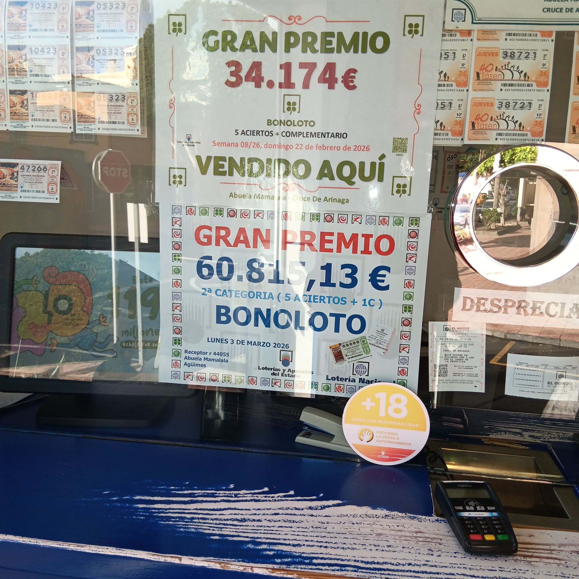 RETURCAN.COM La suerte volvió a sonreír esta semana en el Cruce de Arinaga. Un acertante de la Bonoloto resultó premiado con 60.815,13 euros tras validar su boleto en la administración de lotería “Abuela Mama Lala”, situada en esta zona del municipio de Agüimes. El premio corresponde a la segunda categoría de la Bonoloto (cinco aciertos más el complementario) del sorteo celebrado el pasado lunes 3 de marzo. Según se puede observar en el propio establecimiento, el boleto ganador fue sellado en esta conocida administración del Cruce de Arinaga, lo que ha generado expectación entre vecinos y clientes habituales que estos días comentan la noticia con ilusión. Las administraciones de lotería de los barrios suelen convertirse en punto de referencia para quienes prueban suerte en los distintos sorteos, y cuando llega un premio como este la noticia se extiende rápidamente entre los residentes de la zona. Aunque no ha trascendido la identidad del ganador o ganadora, lo que sí es seguro es que la fortuna ha vuelto a pasar por el Cruce de Arinaga dejando un premio superior a los 60.000 euros. Este tipo de premios, aunque no alcancen las cifras de los grandes sorteos, suponen una alegría importante para quienes resultan agraciados.