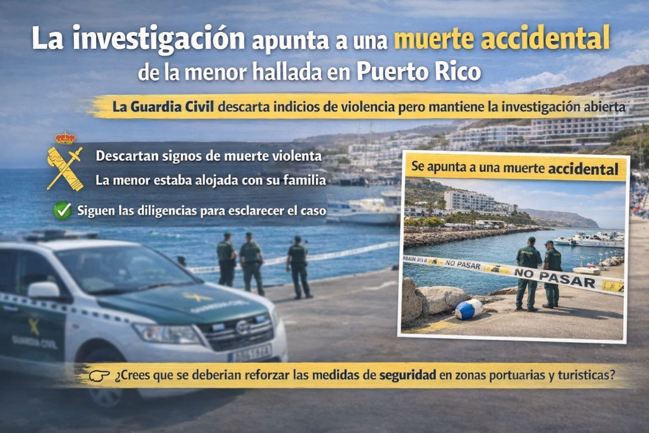 NOTICIAS DEL SURESTE | SUCESOS La investigación abierta por la Guardia Civil sobre el fallecimiento de la menor hallada en el mar en Puerto Rico apunta, en estos momentos, a una muerte de carácter accidental, según las primeras conclusiones de las diligencias en curso. La joven, de origen noruego y nacida en 2010, se encontraba alojada junto a su familia en un complejo turístico de la zona de Agua La Perra, en Mogán. Sin signos de violencia Aunque el atestado aún no está cerrado, las primeras investigaciones no han detectado signos de violencia, lo que refuerza la principal hipótesis de un trágico accidente. Entre las actuaciones realizadas por los agentes se encuentran: • Declaración del testigo que alertó del hallazgo • Recogida de testimonios de personas que la vieron previamente • Declaraciones de familiares para reconstruir lo ocurrido Uno de los testigos asegura haber visto al menor minuto antes caminando sola por el muelle, un dato clave para la investigación. Hallazgo en el mar El cuerpo fue localizado flotando en el agua a primera hora por varias personas, entre ellas el patrón de una embarcación que navegaba por la zona en ese momento. El suceso ha causado una profunda conmoción en la zona, especialmente entre vecinos y turistas que se encontraban en el entorno en ese momento. Investigación abierta La Guardia Civil mantiene abierta la investigación para esclarecer con exactitud las circunstancias del suceso. Todo apunta a un trágico accidente, aunque será el cierre de las diligencias el que determine definitivamente lo ocurrido. Máxima prudencia y respeto ante un caso especialmente sensible.