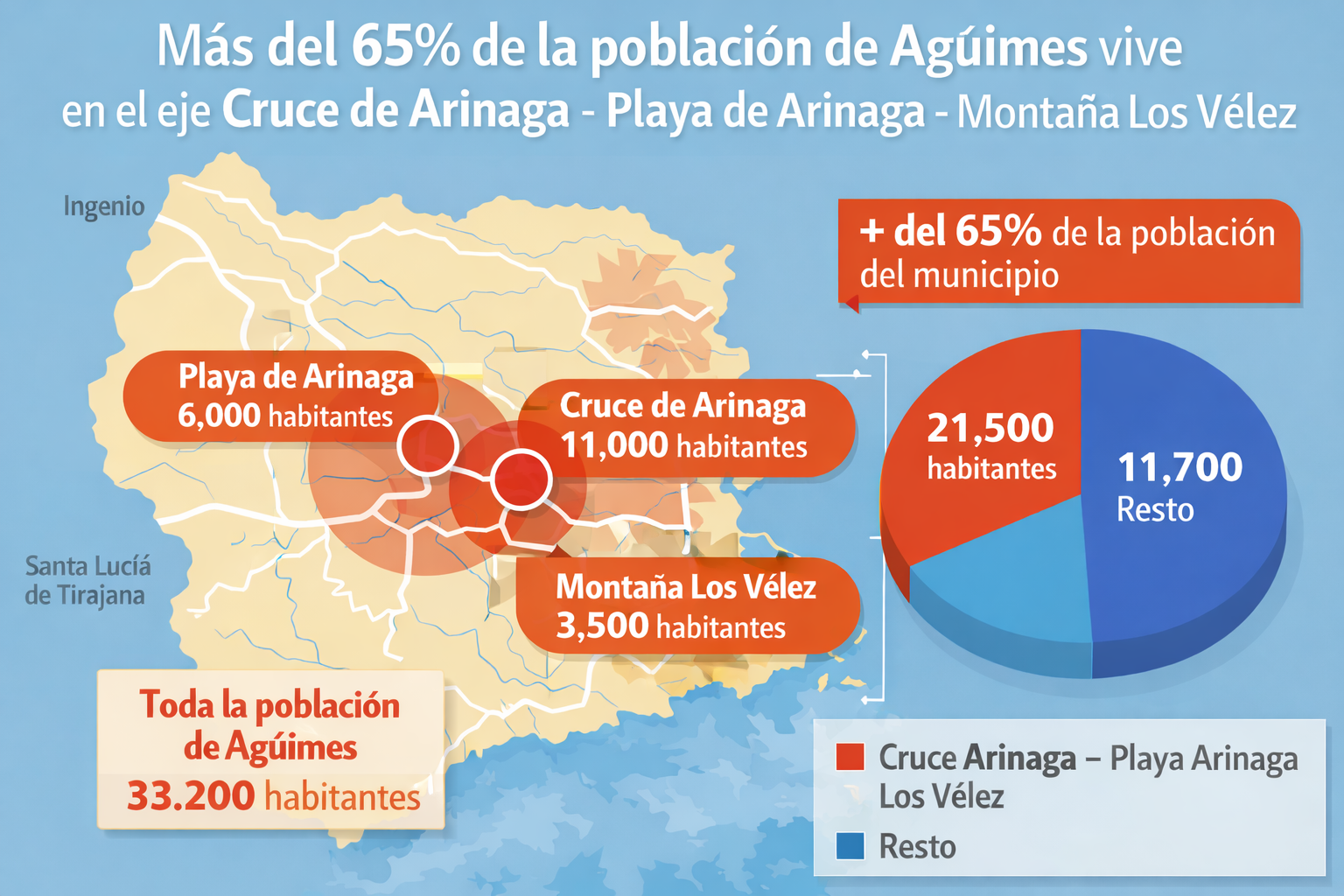 FUENTE: RETURCA. COM Cruce de Arinaga (Agüimes). El barrio del Cruce de Arinaga continúa consolidándose como uno de los principales núcleos poblacionales del municipio de Agüimes y de la comarca del sureste de Gran Canaria. Según distintos datos demográficos recientes, la localidad supera ya los 11.000 habitantes, manteniendo una tendencia de crecimiento sostenido en los últimos años. El Cruce de Arinaga se ha convertido con el paso del tiempo en el mayor núcleo demográfico del municipio, superando incluso al casco histórico de Agüimes en número de residentes. El crecimiento del barrio ha estado vinculado a varios factores, entre ellos su posición estratégica dentro del municipio y la cercanía al Polígono Industrial de Arinaga, uno de los motores económicos del sureste de Gran Canaria. Durante las últimas décadas, el Cruce de Arinaga ha experimentado una transformación urbana importante, con la expansión de nuevas zonas residenciales, el aumento de servicios y la consolidación de áreas comerciales que atienden tanto a los vecinos del propio barrio como a residentes de municipios cercanos. Este crecimiento demográfico ha convertido al Cruce de Arinaga en un punto clave dentro del desarrollo del municipio de Agüimes, reforzando su papel como eje residencial y comercial en la comarca. Al mismo tiempo, el aumento de población plantea nuevos retos relacionados con la planificación de servicios públicos, la movilidad y las infraestructuras necesarias para atender a una comunidad cada vez más numerosa. ________________________________________