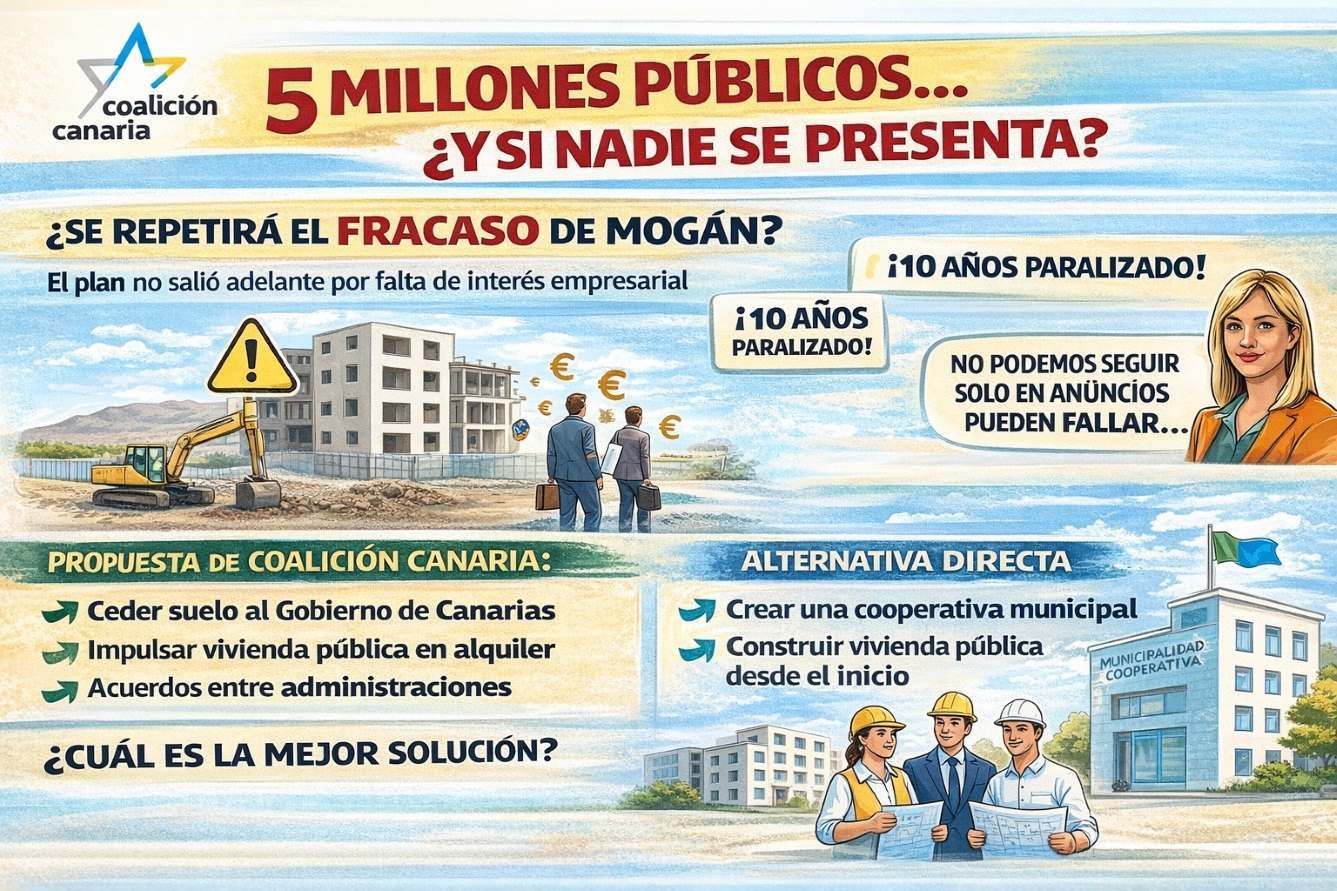 NOTA DE PRENSA Coalición Canaria cuestiona el modelo de vivienda de Agüimes: “No es atractivo para las empresas y puede volver a quedar bloqueado” El Grupo Municipal de Coalición Canaria en Agüimes, a través de su portavoz Bárbara Cabrera, ha advertido que el modelo de vivienda impulsado por el grupo de gobierno “no está generando el atractivo necesario para el sector empresarial”, lo que podría derivar en nuevos retrasos en la ejecución de los proyectos. Estas declaraciones se producen tras conocerse que el Ayuntamiento ha tenido que inyectar cerca de cinco millones de euros de fondos públicos para intentar hacer viables las futuras licitaciones, después de que las empresas constructoras trasladaran que los planteamientos iniciales no se ajustaban a la realidad económica del mercado. “Un modelo que ya ha generado dudas” Desde Coalición Canaria recuerdan que esta situación “viene a confirmar lo que ya advertimos desde la oposición”. “Estamos ante un proyecto que, tal y como estaba diseñado, no resultaba atractivo para las empresas. Ahora se intenta corregir con dinero público, pero seguimos teniendo dudas sobre su viabilidad real”. Además, desde la formación nacionalista señalan que no es la primera vez que un modelo similar encuentra dificultades, recordando el caso de Mogán, donde una iniciativa comparable no logró salir adelante por la falta de interés empresarial. Riesgo de repetir errores del pasado En este contexto, Cabrera ha insistido en que será clave observar el resultado de las próximas licitaciones: “Veremos cuántas empresas se presentan” “Veremos si las obras se adjudican en plazo” “Y, sobre todo, veremos si se ejecutan o vuelven a quedar paralizadas” “Agüimes no puede permitirse otros diez años de proyectos bloqueados. La vivienda es una urgencia social, no un experimento”. Alternativa: suelo público y modelo directo Frente al modelo actual, Coalición Canaria plantea una estrategia clara y sin intermediarios: Ceder suelo municipal al Gobierno de Canarias Impulsar vivienda pública en régimen de alquiler Establecer acuerdos entre administraciones que aceleren los plazos Pero además, la formación nacionalista abre una segunda vía: Impulsar una cooperativa o fórmula de promoción pública directa “Si el Ayuntamiento aporta el suelo y además destina cinco millones de euros, debe plantearse seriamente ejecutar directamente las viviendas. Así serían públicas desde el inicio y se evitarían incertidumbres”. Una prioridad social que exige decisiones eficaces Coalición Canaria insiste en que el acceso a la vivienda es uno de los principales problemas del municipio, especialmente en zonas como Agüimes casco o el Cruce de Arinaga. “Cada retraso es tiempo perdido para muchas familias. Agüimes necesita soluciones reales, no más pruebas”. “Menos experimentos y más soluciones” Desde el grupo de Coalición Canaria concluyen con un mensaje claro: “Defendemos un modelo basado en la colaboración institucional o en la promoción pública directa, que evite riesgos, acorte plazos y garantice resultados. Porque en vivienda, lo importante no es anunciar proyectos… sino que se construyan”.