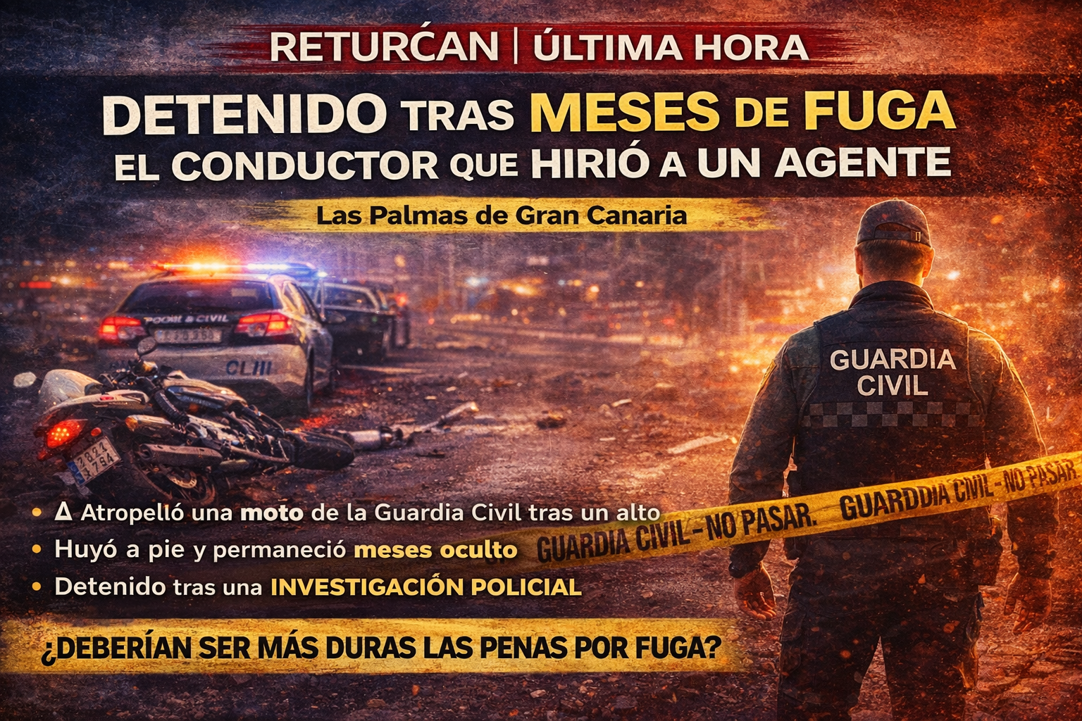 NOTICIAS DEL SURESTE | SUCESOS Detenido el conductor que hirió a un agente tras meses de fuga en Las Palmas de Gran Canaria La Guardia Civil ha detenido al presunto autor de un grave suceso ocurrido en Las Palmas de Gran Canaria, donde un agente de tráfico resultó herido tras una persecución. La detención se produce meses después, tras una investigación coordinada por unidades especializadas. Huida tras el alto policial Los hechos se remontan al 3 de julio de 2024, cuando los agentes detectaron un vehículo circulando de forma irregular por la GC-309, en la zona de Pedro Hidalgo. Al darle el alto para someterlo a pruebas de alcohol y drogas, el conductor desobedeció y emprendió la fuga, generando una persecución por vías urbanas. Durante la huida, realizó una maniobra marcha atrás en sentido contrario, impactando contra una motocicleta oficial y provocando heridas al agente. Fuga a pie tras el accidente Tras el impacto, el vehículo quedó inmovilizado. El conductor abandonó el coche y huyó a pie, logrando escapar en ese momento. Meses de investigación El Grupo de Investigación y Análisis de Tráfico (GIAT) asumió el caso, recopilando pruebas, testimonios e imágenes. Finalmente, el pasado 12 de marzo, el sospechoso fue localizado y detenido en un dispositivo de vigilancia. Delitos imputados El detenido se enfrenta a varios delitos: • Conducción temeraria • Atentado contra agente de la autoridad • Abandono del lugar del accidente • Daños en vehículo oficial • Conducir sin permiso (pérdida total de puntos) El caso ha sido remitido al Juzgado de Instrucción nº 3 de Las Palmas de Gran Canaria. Un caso que pone sobre la mesa dos realidades: riesgo en carretera y falta de responsabilidad al volante. La actuación policial ha permitido cerrar el círculo meses después.