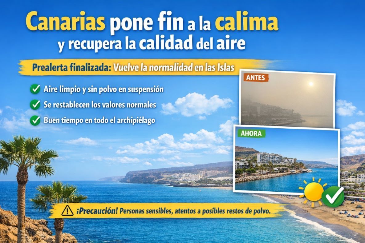 NOTICIAS DEL SURESTE: Canarias pone fin a la calima y recupera la calidad del aire desde hoy El Gobierno de Canarias da por finalizada la prealerta tras mejorar las condiciones meteorológicas en todo el archipiélago. El Gobierno de Canarias ha dado por finalizada la situación de prealerta por calima en todas las islas a partir de las 12:00 horas de este viernes, tras confirmarse una mejora generalizada de la calidad del aire. La decisión ha sido adoptada por la Dirección General de Emergencias, en base a los datos facilitados por la Agencia Estatal de Meteorología y los sistemas de control de calidad del aire del archipiélago, dentro del marco del Plan Específico de Emergencias de Canarias por Fenómenos Meteorológicos Adversos (PEFMA). Durante los últimos días, la presencia de polvo en suspensión había afectado especialmente a la visibilidad y a la salud de personas con patologías respiratorias. Sin embargo, las mediciones actuales reflejan una vuelta a niveles normales, permitiendo recuperar la actividad habitual sin restricciones. Vuelta a la normalidad en todo el archipiélago Las autoridades confirman que: • La calidad del aire ha mejorado significativamente • Se han restablecido los valores habituales en las estaciones de medición • No se prevén nuevos episodios de calima a corto plazo Recomendación final Aunque la situación ha mejorado, se recomienda a la población más sensible mantener precaución ante posibles restos de polvo en suspensión, especialmente en horas de viento. Canarias deja atrás varios días marcados por la calima y vuelve a la normalidad. Una noticia positiva que devuelve el aire limpio… y la tranquilidad. ¿Has notado ya la mejoría en el aire o aún sigue afectando en tu zona?